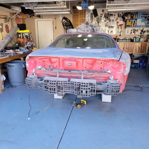 TA 2 end of day 8. Spoiler off, wheels off, deck lid sanded and up on blocks:
