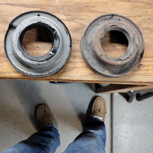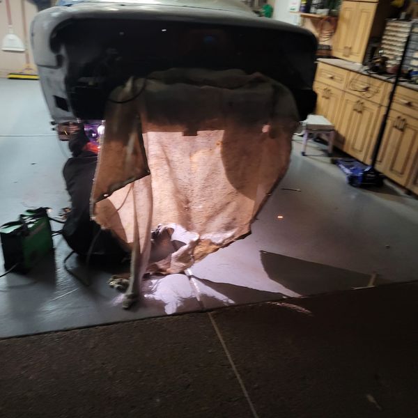 Dropped rear end. Cut off 4 more feet of exhaust. Removed rear springs. Scrubbed it all down with white vinegar. Sandblasted spring seats. After and before image -->