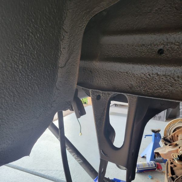 TA 2, day 10. Rear bumper, tie rod sway bar off, cleaned calipers, sanding loose rust before blasting: