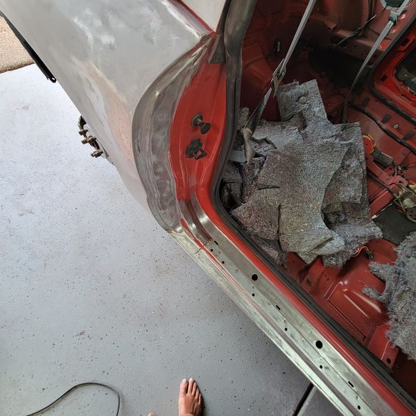 These wheels and tires will be replaced. They are just for moving the car around. Got some work to do on the right rear quarter panel: