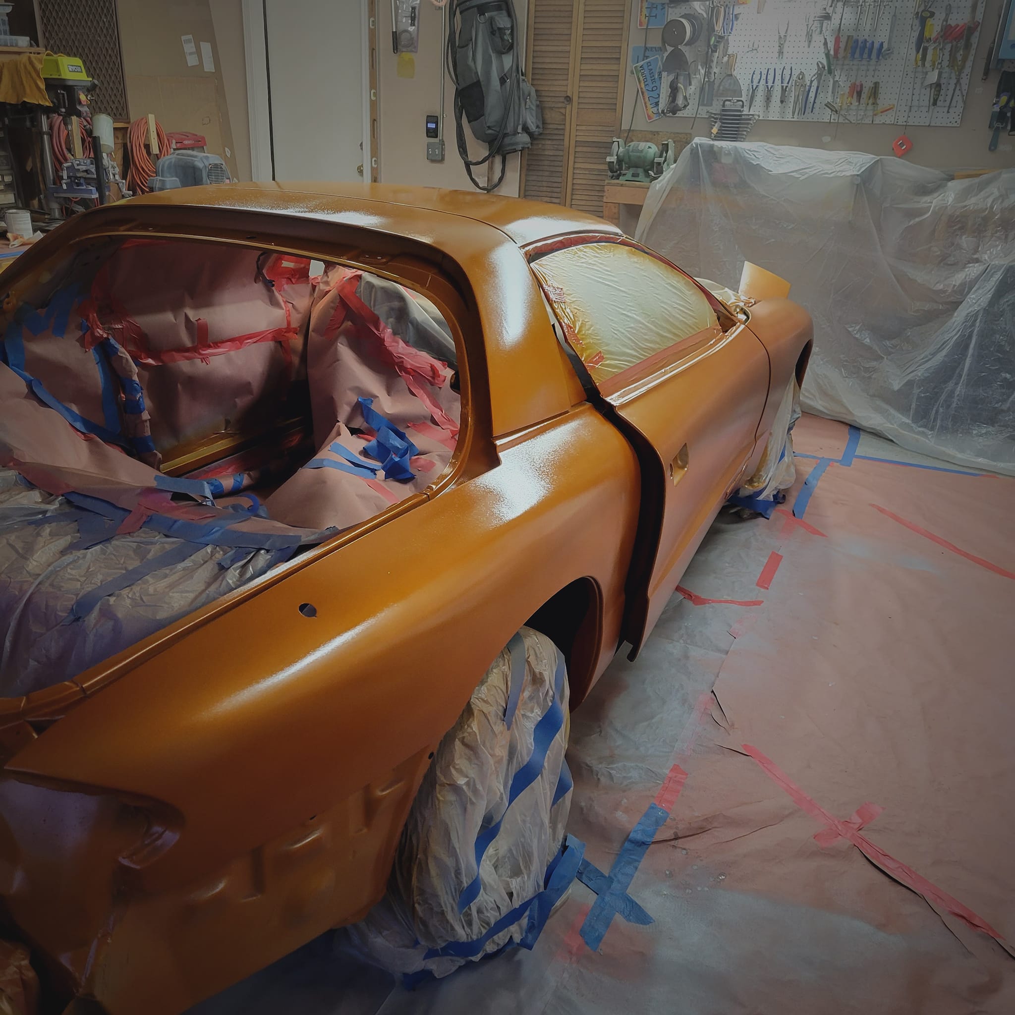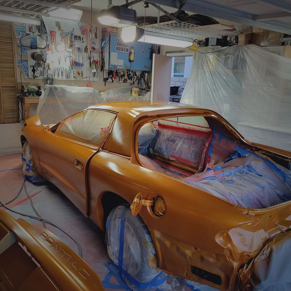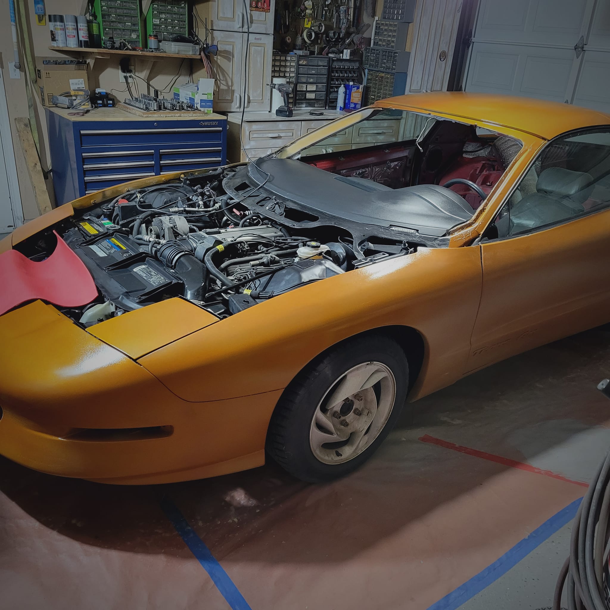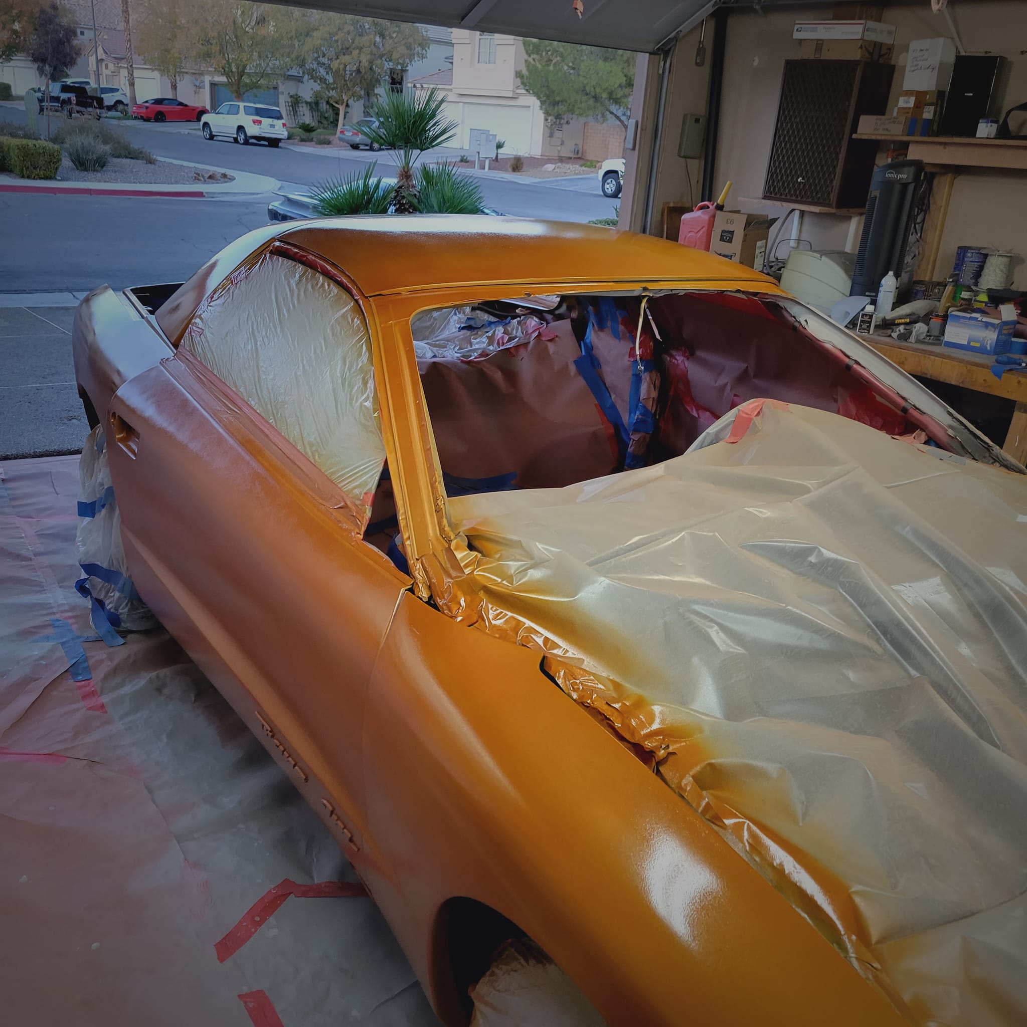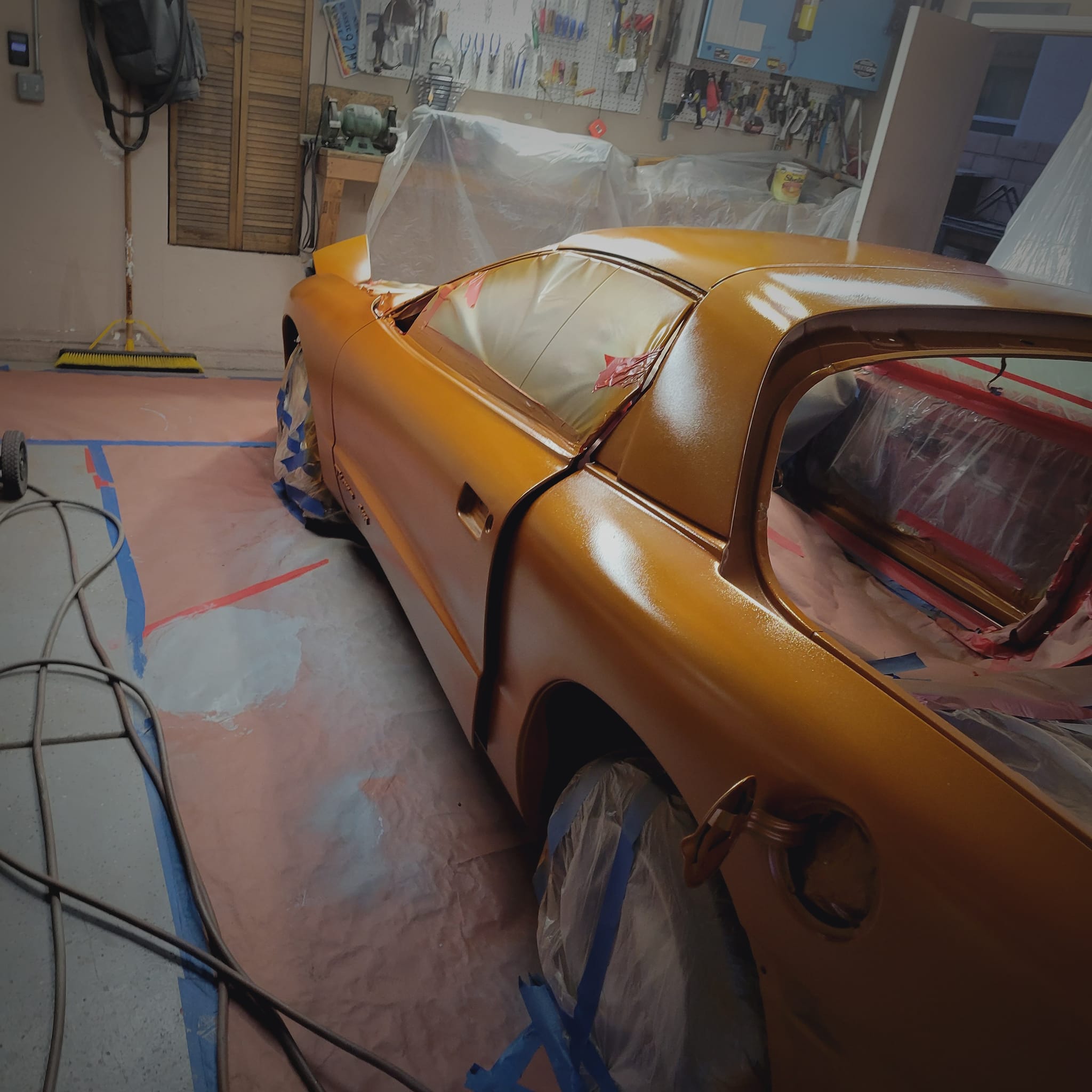TA2 day 45: 3 coats of hardened spray primer done on top sides of hood, spoiler, side mirror housings, and hood pull cups. Doing rear bumper today and the bottom of the hood and spoiler. Pharaoh's Gold this week, maybe with some candied orange. Will play with mixes Monday.