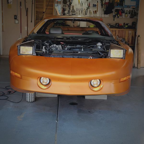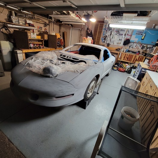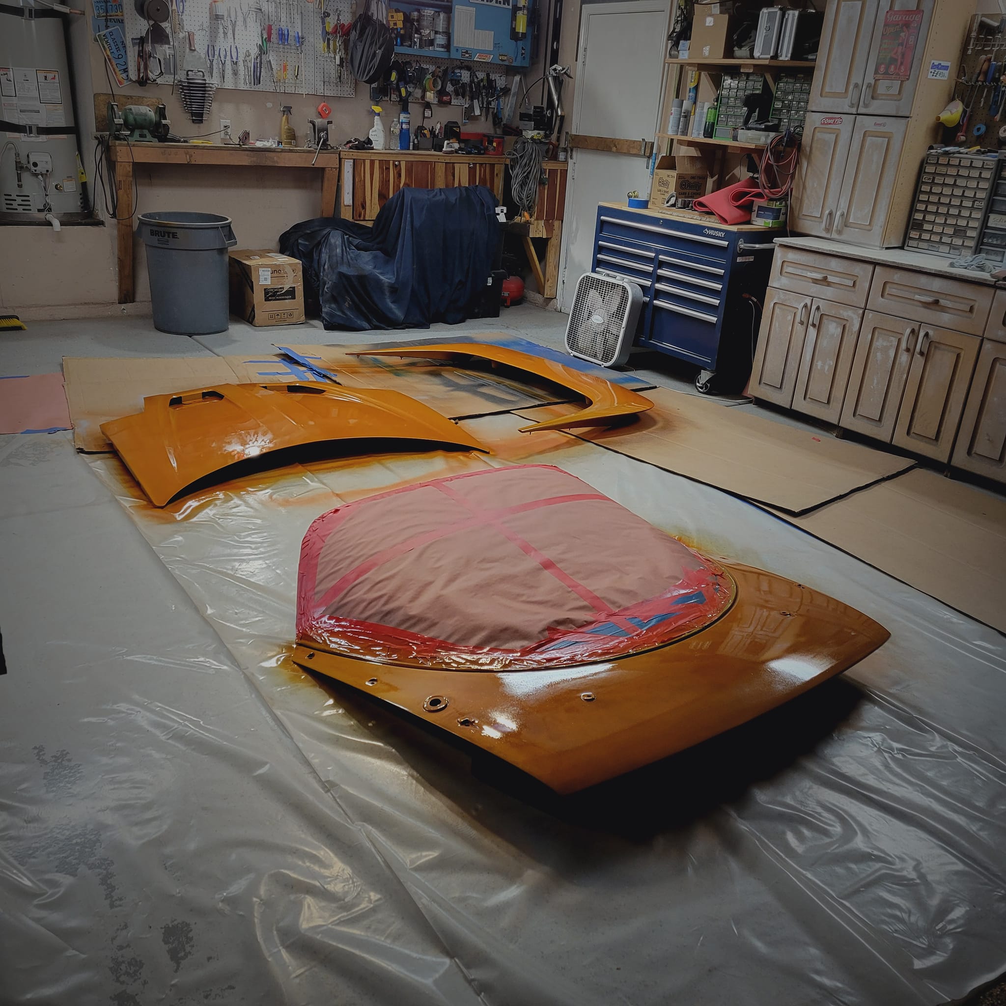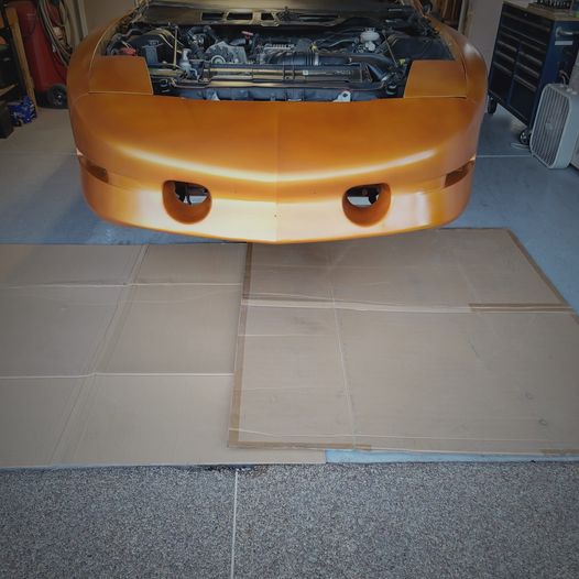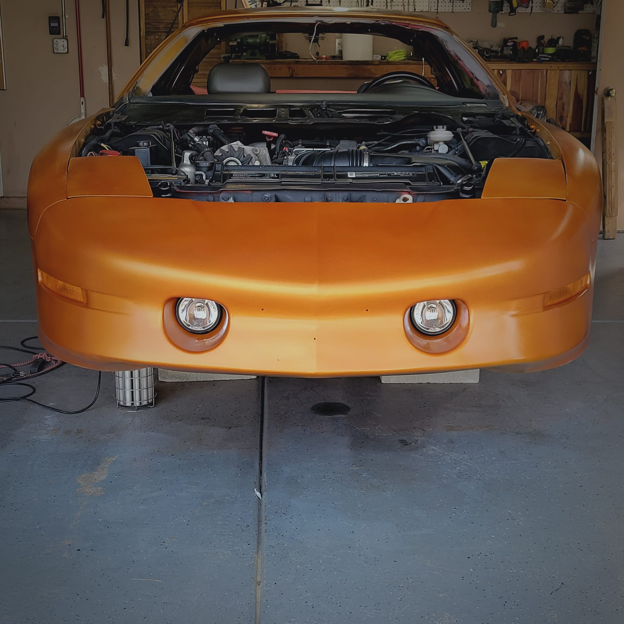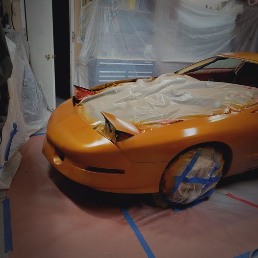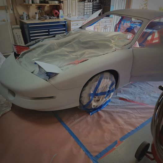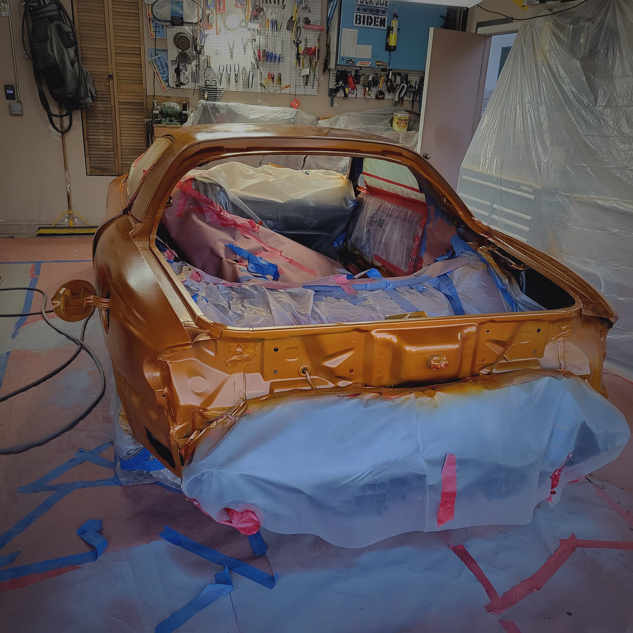 TA2 day 45: 3 coats of hardened spray primer done on top sides of hood, spoiler, side mirror housings, and hood pull cups. Doing rear bumper today and the bottom of the hood and spoiler. Pharaoh's Gold this week, maybe with some candied orange. Will play with mixes Monday.