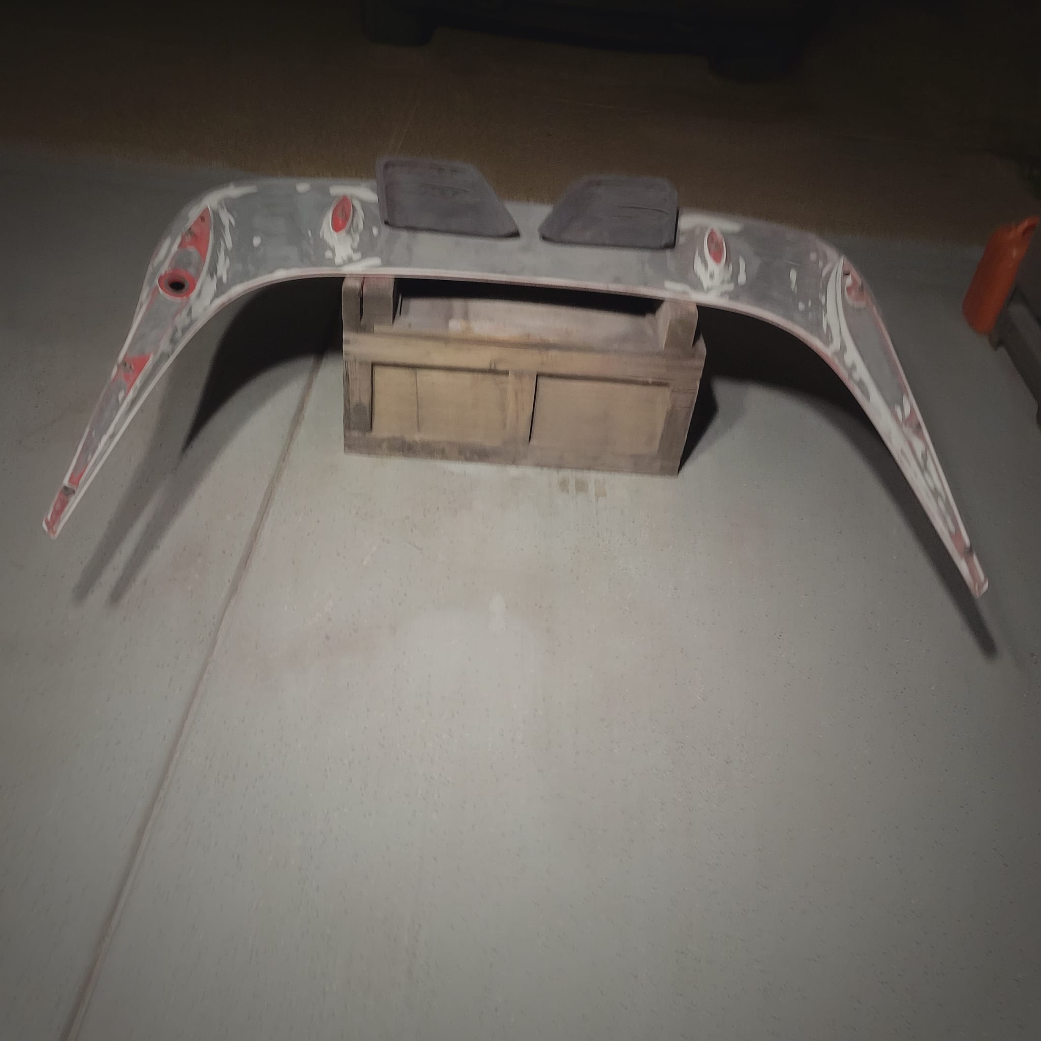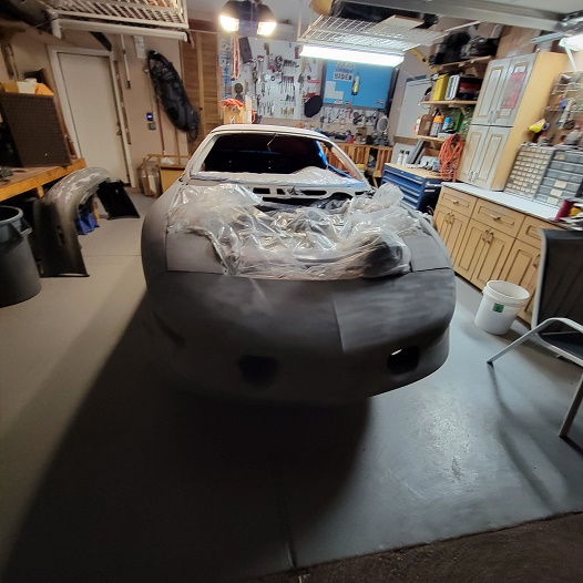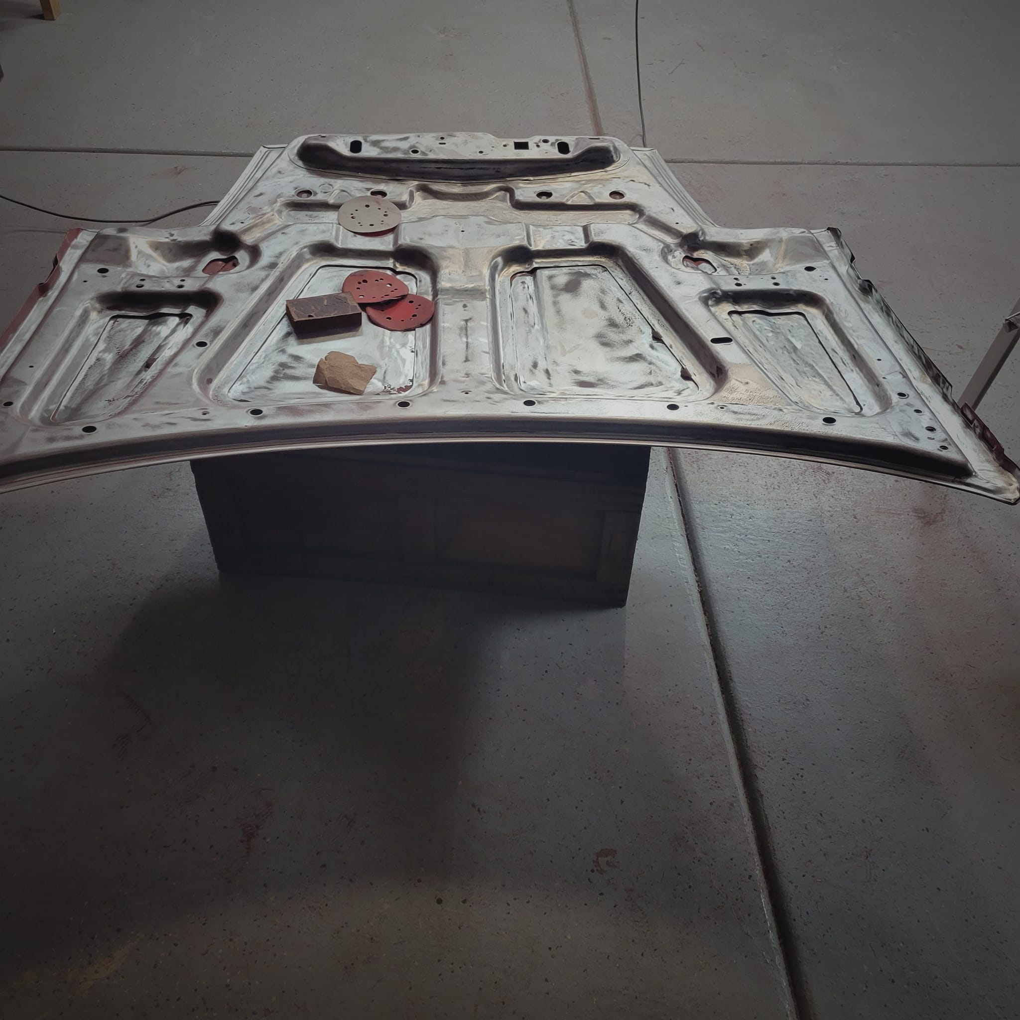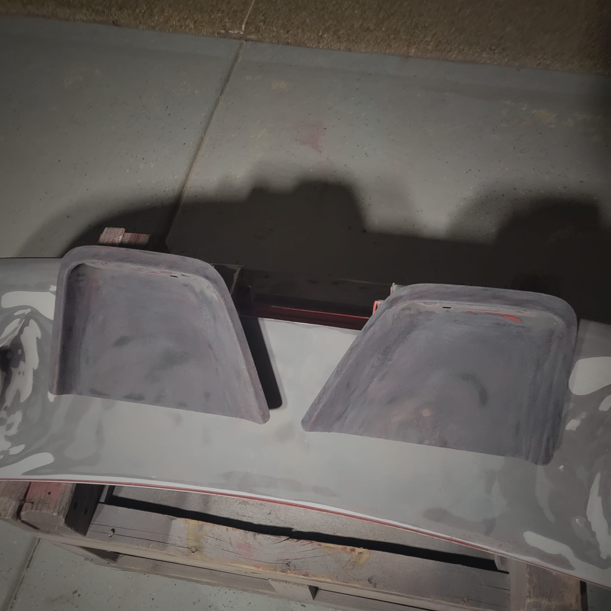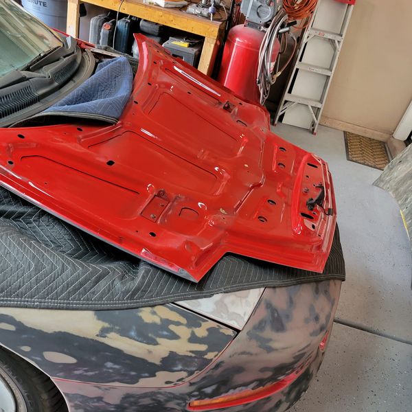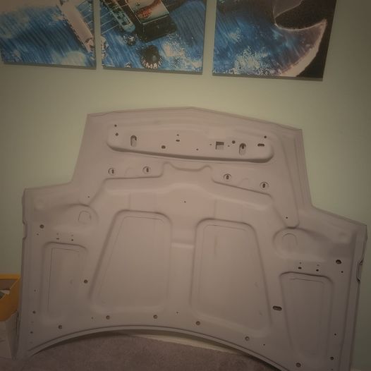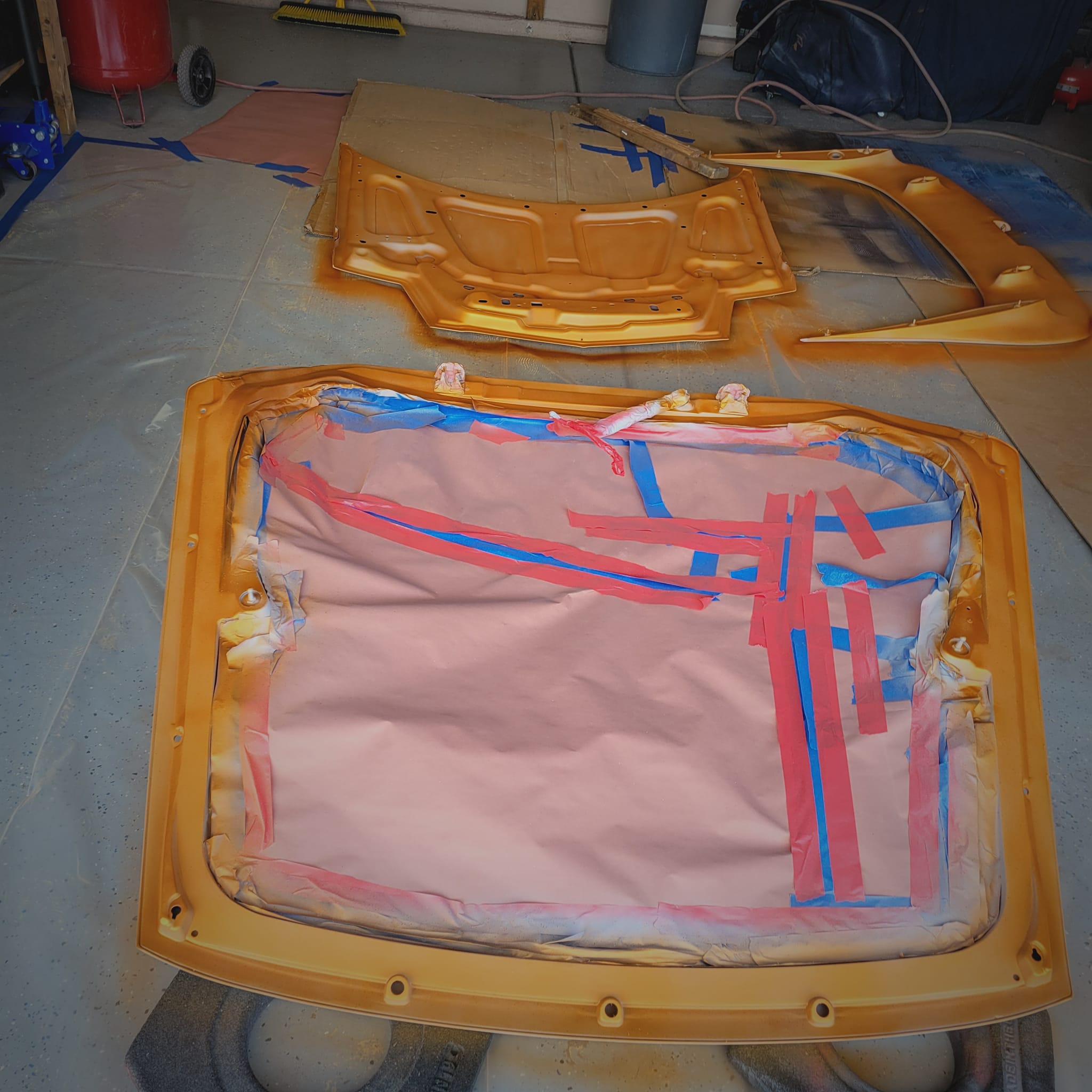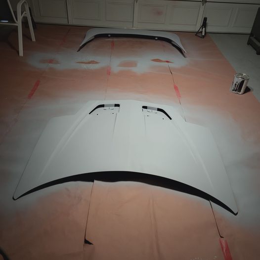 TA 2 Day 40: Finished initial prime on the spoiler top and bottom, the hood top and bottom and the hood inserts. Finished the hood hardware --> high heat flat black with clear on top. Mirror housing fine sanding tomorrow and base priming. I sand blasted those so just need to smooth them out a bit before priming. Then will get it back inside to do the door frames and jambs. Hood safely back in the house: