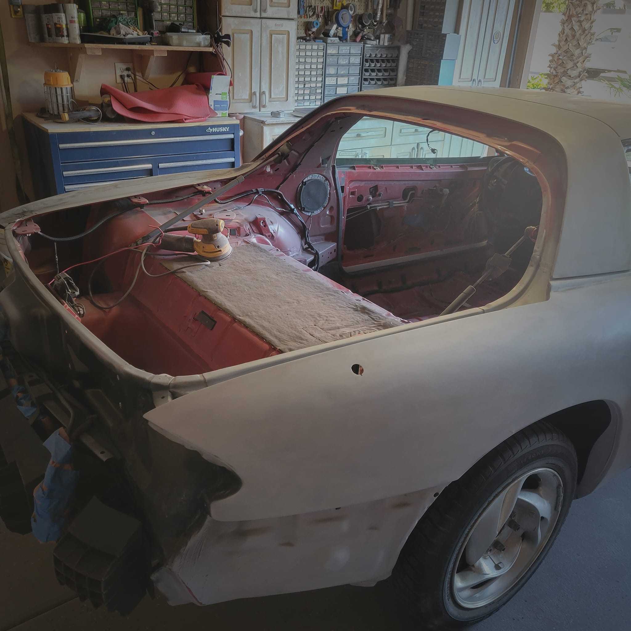 TA 2 Day 41: Car back inside. Cleaned up the fog light and turn signal pockets. Full 220 prep sand of whole car. Today we finish the door jambs and underside of the hatchback. Then its final wash down, taping and ready to start spraying paint next week: