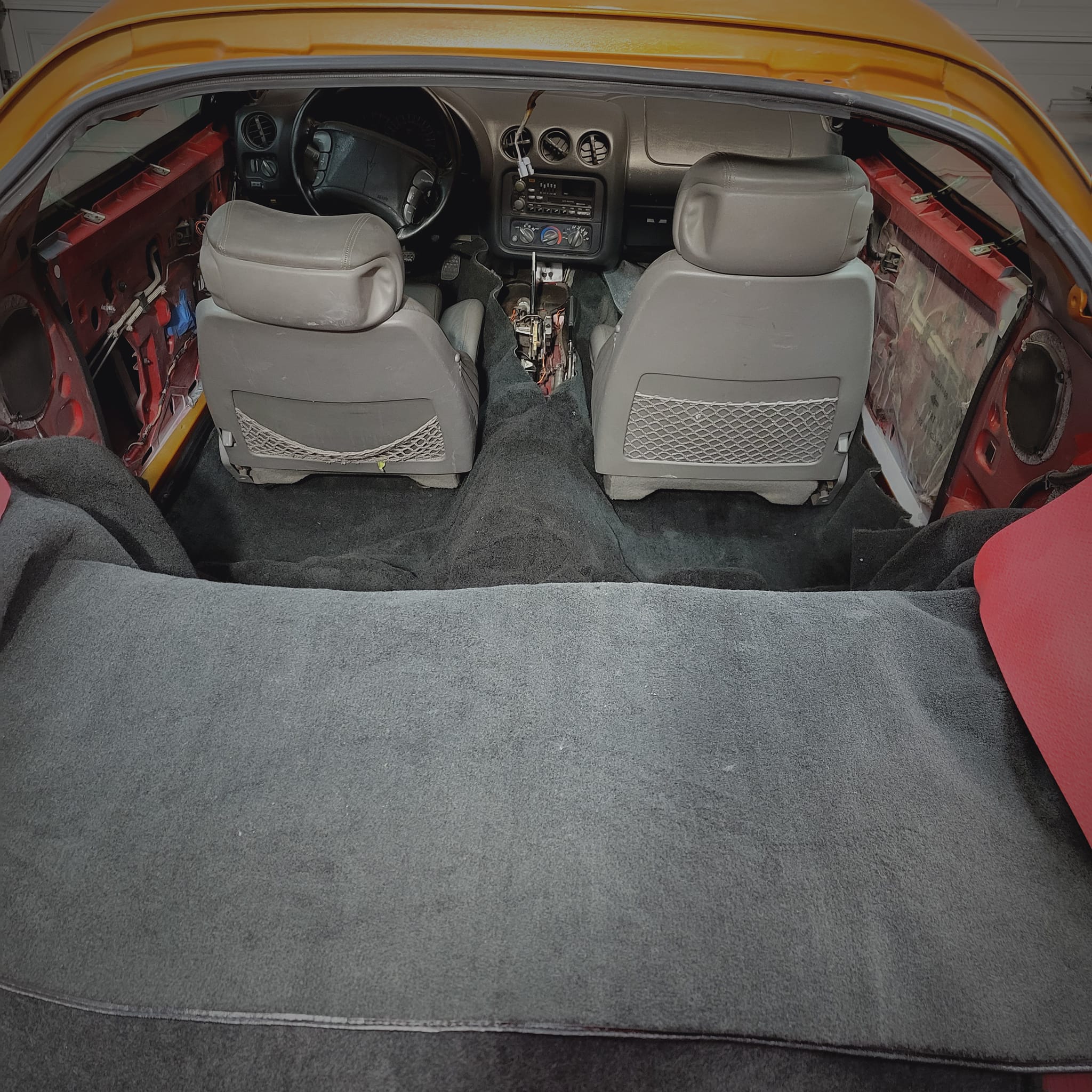 TA 2 day 59: I sprayed my hood inserts jet black and clear coated them and set them aside to harden for a few days. About to get back on the interior. Seat belt assemblies going in next so I can finish trimming the carpeting in the rear. Then I can finish trim the carpet around the console opening.