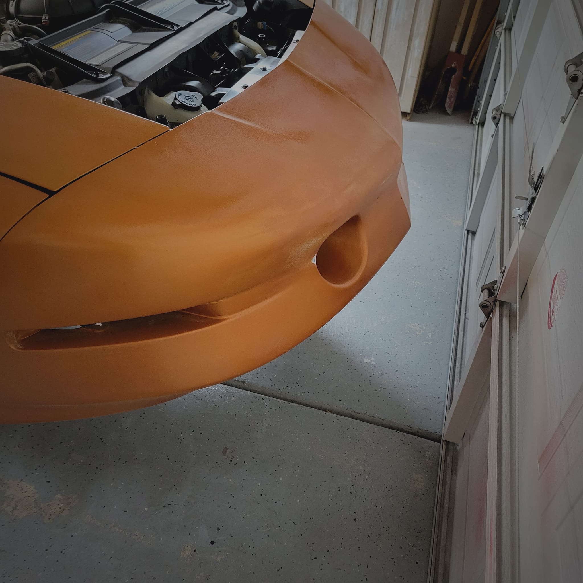 TA 2, day 56: Re-sprayed the front bumper and fog light pockets with less orange and more white. Love the look and the transitions. Real glad I winged it on the mix. Touched up some other spots too. Blended real nice.