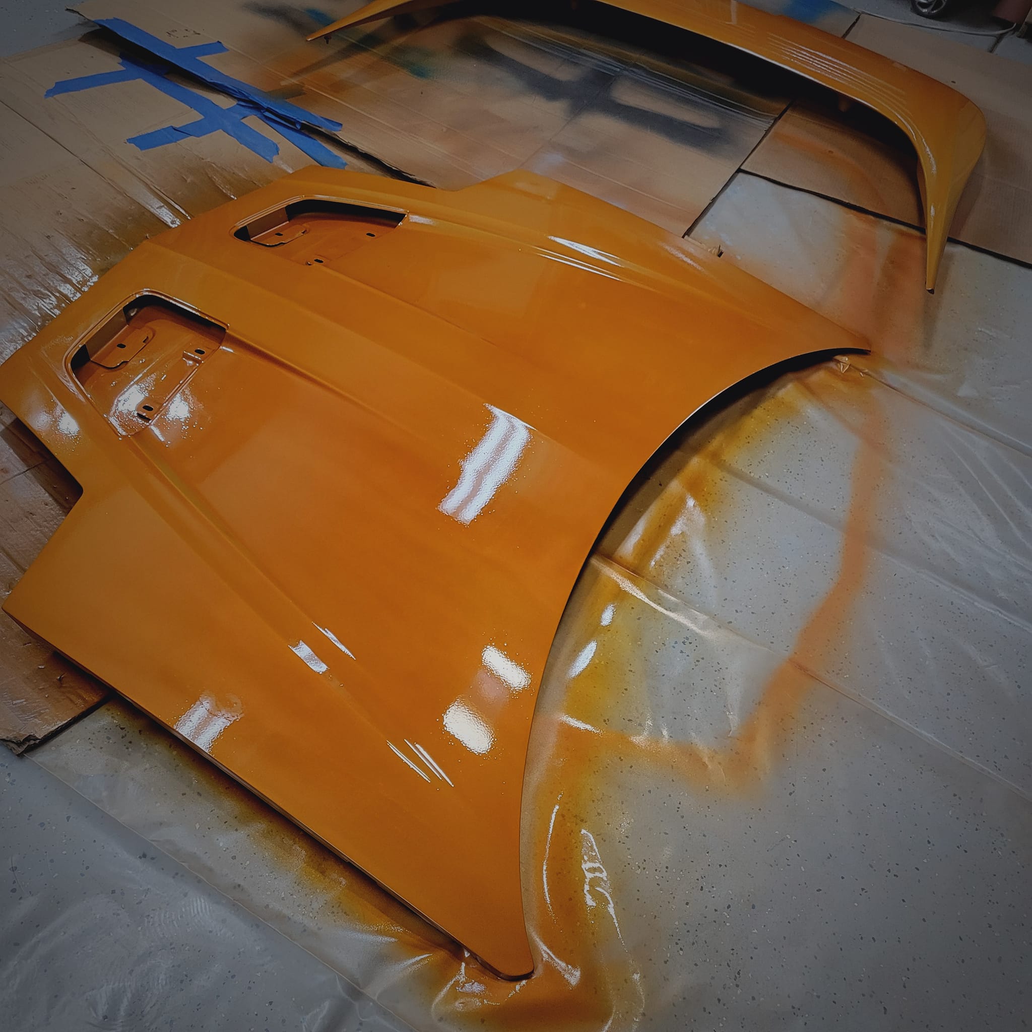 TA 2, day 62: Spraying Dreamsicle orange under hood, spoiler and hatchback.