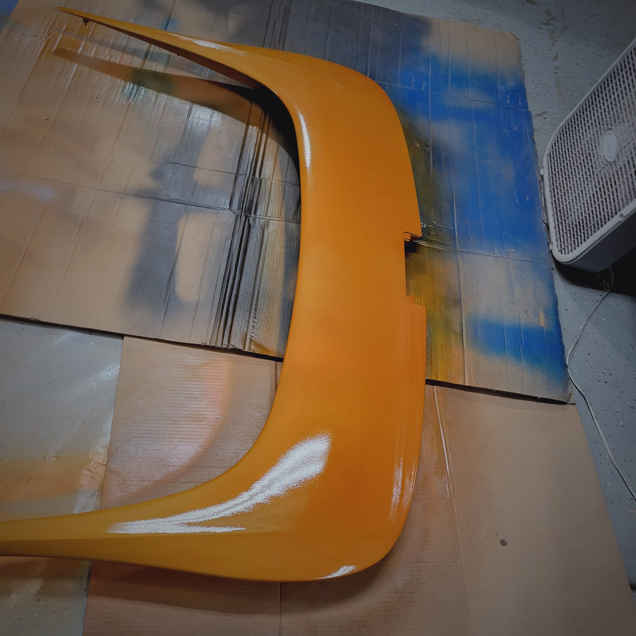TA 2, day 63: Today was a great day. Finished painting the last 3 big items. The hood, spoiler and hatchback topsides. These are the bright orange topside parts with 3 wet coats of clear. 11 paint coats total, of bare metal primer, sandable primer, hardened primer, orange and clear. Looking really nice. Minimal orange peel. Sprayed gun at 30 psi with 2 inline water filters with a 165 psi, 6 gallon, compressor.