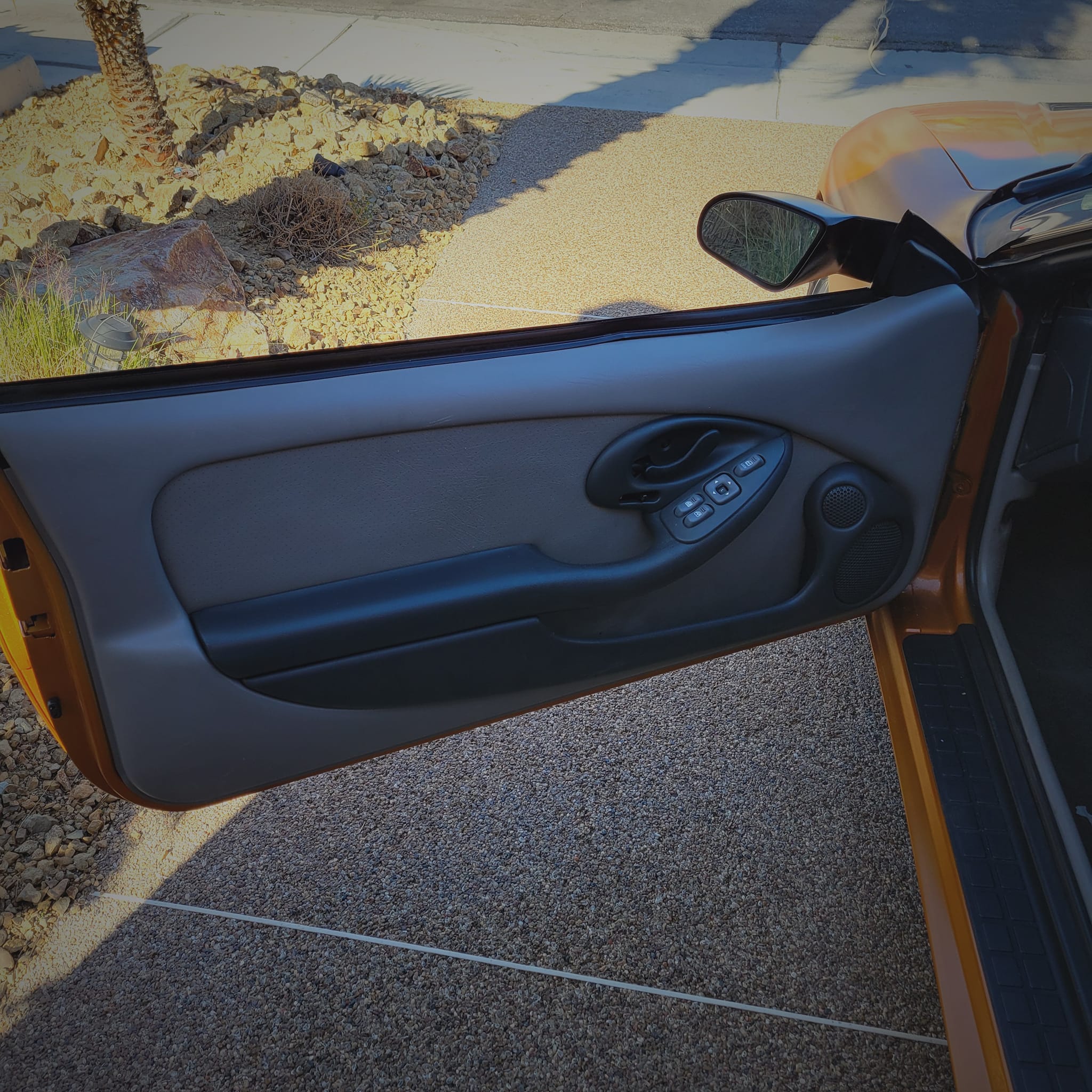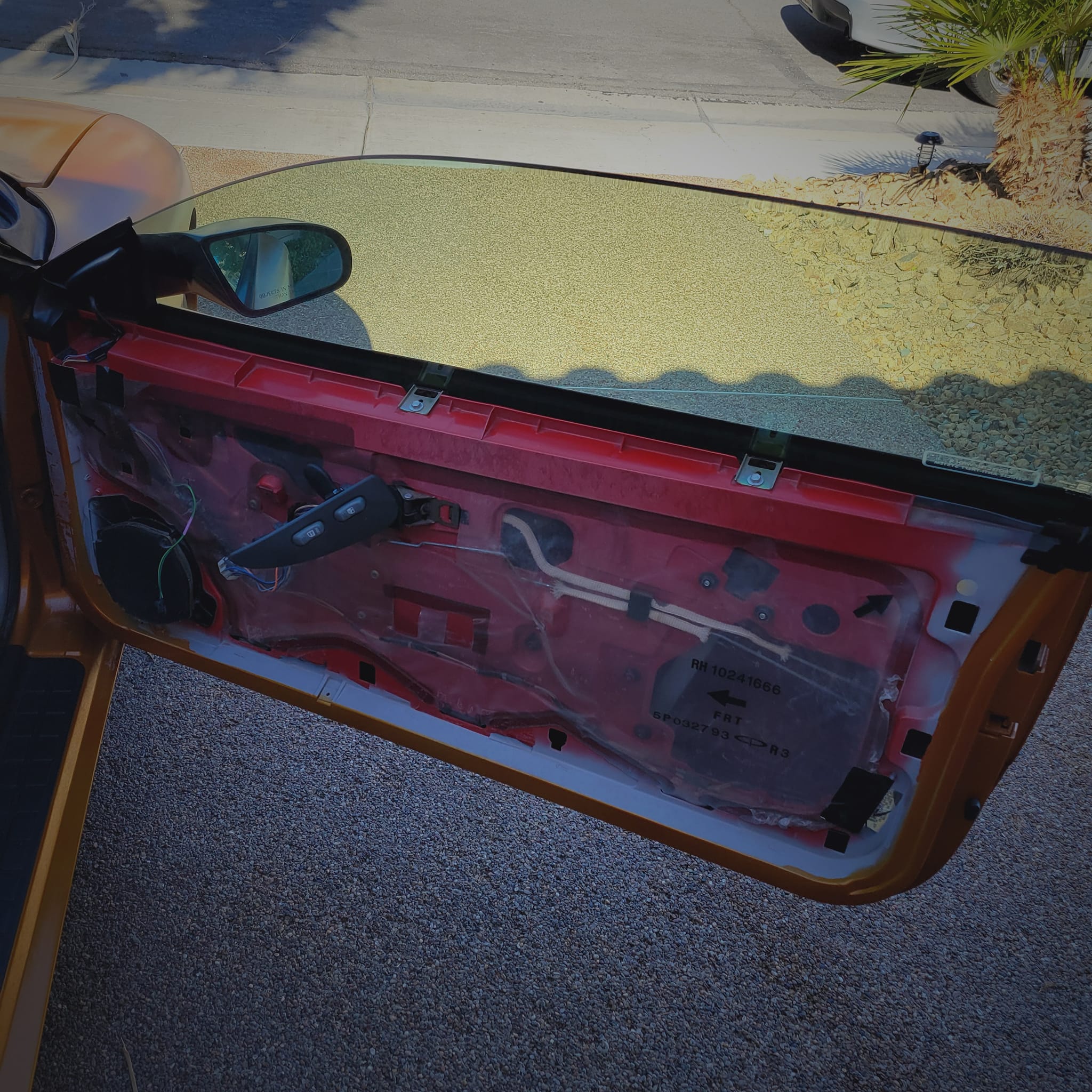 TA 2, DAY 67: door panels going in, black mirror housings done/on, trim black triangles on, new RH headlight rear glare guard on.